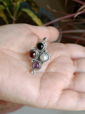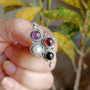 This elegant handmade ring design is simple and eye-catching. The Purple, Red Brown, White, and Black color of the gemstones are such that they will go well with all attires.