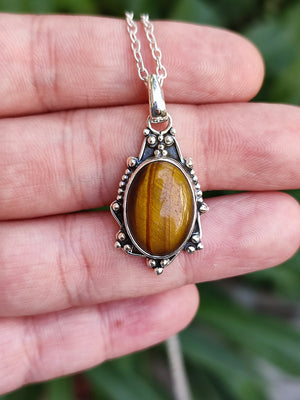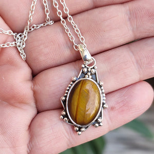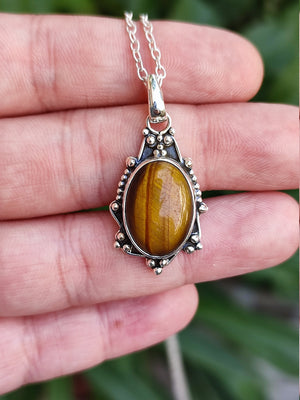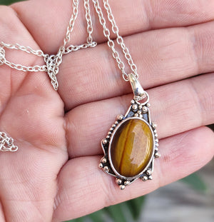 Natural Tigers Eye Sterling Silver Handmade Locket Pendant Chain Necklace, Tiger Eye Gemstone Boho Silver Necklace, Gift for Her