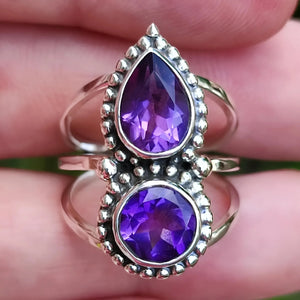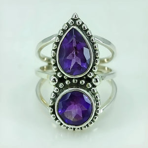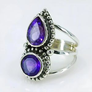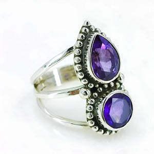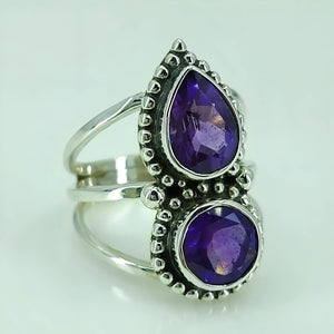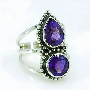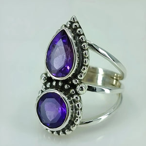 Indulge in the beauty of the Amethyst Pear size 7 x 10 mm and Round 9 mm. Sterling Silver Handmade Cocktail Women's Ring and embrace its captivating charm. Elevate your style and revel in the compliments you'll receive with this exquisite piece of jewelry that celebrates the essence of femininity and sophistication. Order yours today and experience the enchantment of our stunning Amethyst cocktail ring.