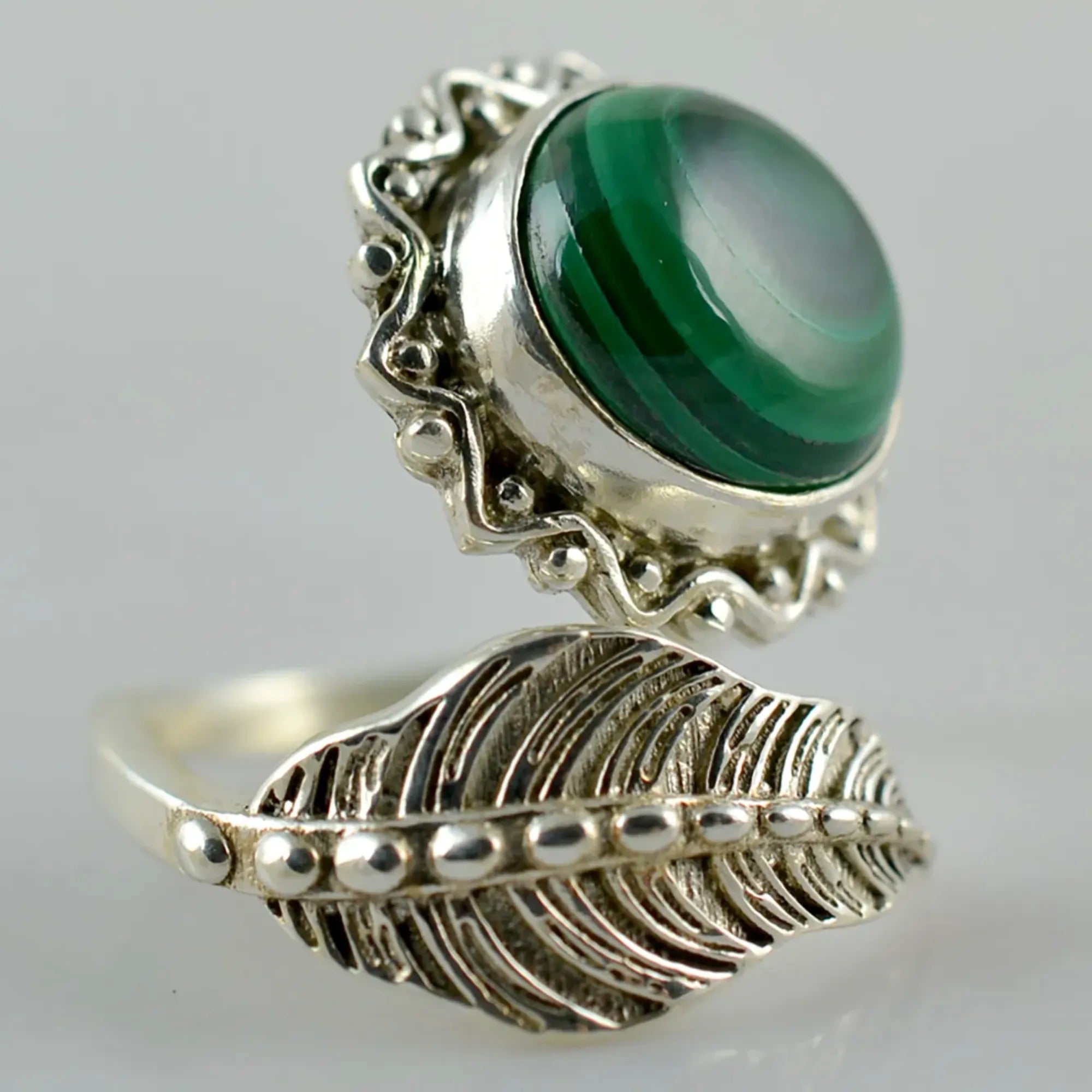 Navya Craft Malachite Round 925 Sterling Silver Handmade Statement Women Adjustable Leaf Ring, Green Gemstone Ring for Christmas Anniversary Birthday Valentine day Gift wife her mother