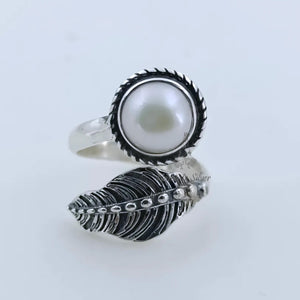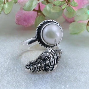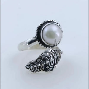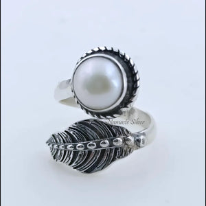 Pearl Ring, 925 Sterling Silver Adjustable Leaf Ring, Freshwater Pearl Handmade Nature Inspired Jewelry, Unique June Birthstone Gift For Her