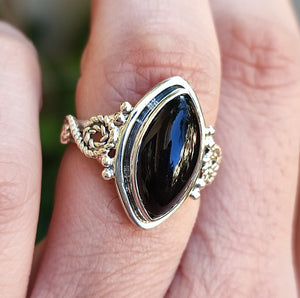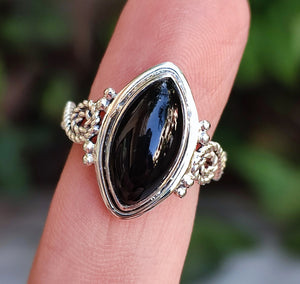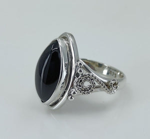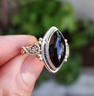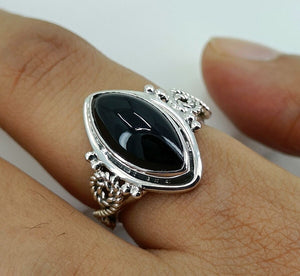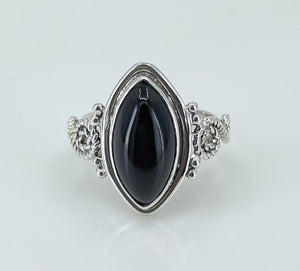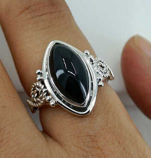 Embrace the enigmatic allure of black onyx with this captivating marquise ring. Handcrafted from gleaming sterling silver, this ring features a mesmerizing black onyx gemstone, perfect for December birthdays. Let its sleek, polished surface add a touch of timeless elegance to your everyday look.