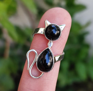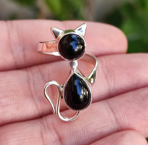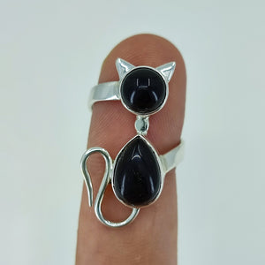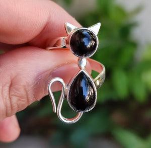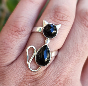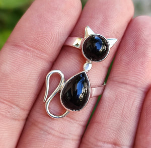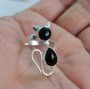 Black Onyx Silver Cat Ring, Handmade Sterling Silver Cat Ring, Black Gemstone Ring, Silver Black Cat Ring, Gift for her, Ring for Cat Lovers