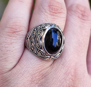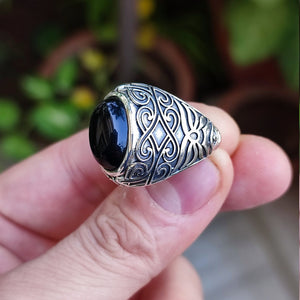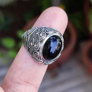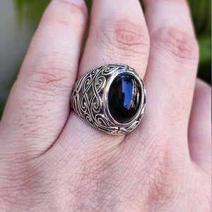 Each ring is meticulously crafted by our skilled artisans, ensuring that every detail is perfect. The process begins with selecting the finest black onyx gemstones, known for their deep, mesmerizing hue and powerful protective qualities. The stones are then expertly cut and polished to enhance their natural beauty before being set in the sterling silver band.