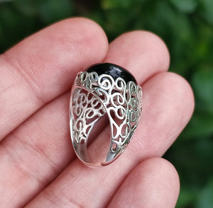 Imagine the way this ring catches the light, the black onyx glinting like a hidden star while the silver filigree shimmers with subtle brilliance. Whether you're dressing up for a special occasion or adding a touch of magic to your everyday look, this ring is sure to turn heads and spark conversations.