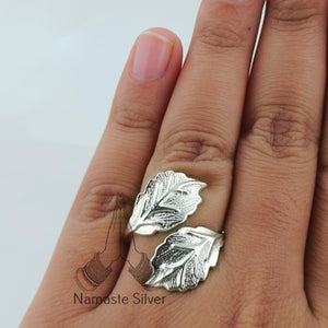 Dual Leaf sterling silver Ring Size Adjustable Handmade Statement Ring Plant Lover Gift for Her Birthday Anniversary Christmas Valentine Day