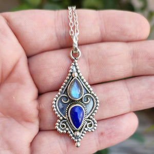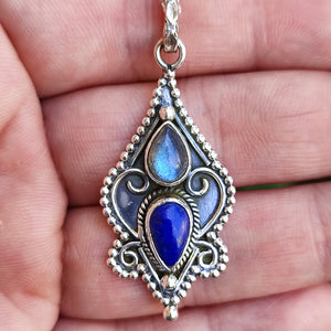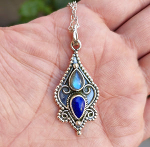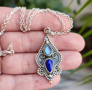 Elevate your gifting game with this exquisite Labradorite and Lapis Lazuli necklace, meticulously crafted in 925 solid sterling silver. Handmade with precision and passion, this stunning piece is designed to captivate. The iridescence of natural Labradorite complements the deep blue allure of Lapis Lazuli, creating a harmonious blend of colors.