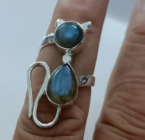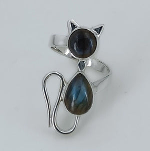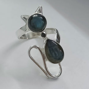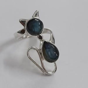 The cat-inspired silhouette adds a playful and charming touch to this ring, making it a perfect accessory for cat lovers and those who appreciate the magic of Labradorite. Labradorite, with its iridescent play of colors, brings a sense of mystery and enchantment to the piece, creating a mesmerizing effect that complements any outfit.
