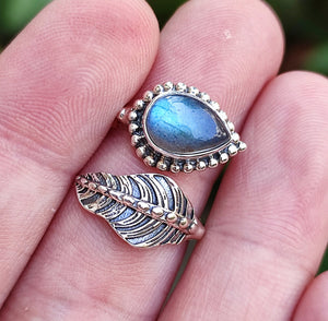 The adjustable design ensures a perfect fit for every finger, making it a versatile accessory for girls and women alike. The intricate leaf detailing on the band adds a touch of whimsy and charm, making this ring a symbol of natural grace and sophistication. Whether worn as a standalone statement piece or paired with other jewelry, this Labradorite Leaf Ring is sure to turn heads and spark conversations.