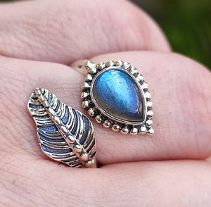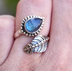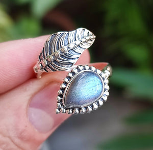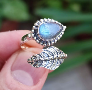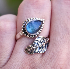 Natural Labradorite Ring, Labradorite Silver Ring, Labradorite Ring, Labradorite Statement Pearshape Ring, Labradorite Adjustable Leaf Ring