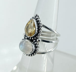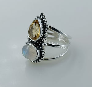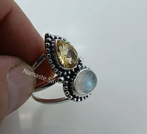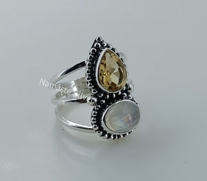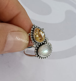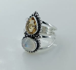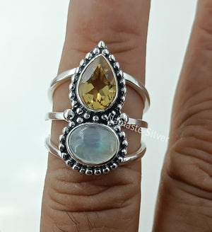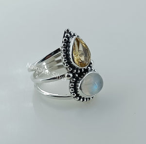 Natural Citrine, Rainbow Moonstone 925 Sterling Silver Handmade Statement Women Ring, Citrine Silver Ring, November Birthstone Ring