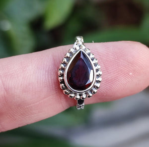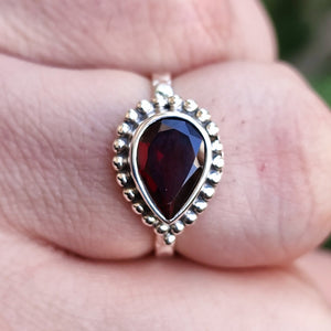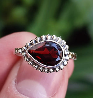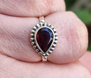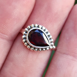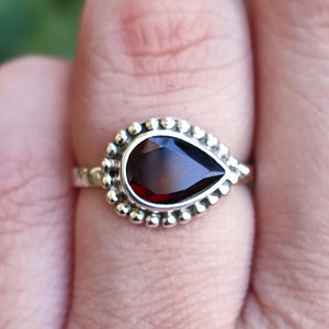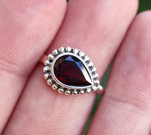 A pear-shaped garnet gemstone is set on this delicate sterling silver ring and it is surrounded by tiny dots all around the Garnet Stone.