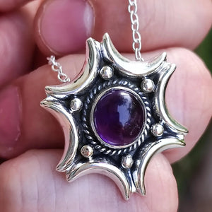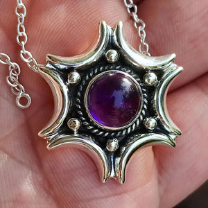 Each necklace is meticulously handmade by skilled artisans, ensuring that every piece is unique and of the highest quality. The sterling silver setting enhances the beauty of the natural amethyst, providing a durable and luxurious finish that will last for years.