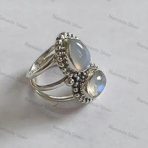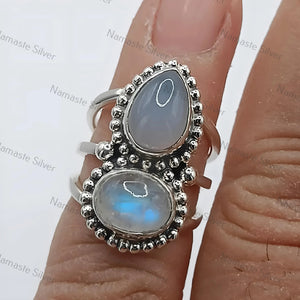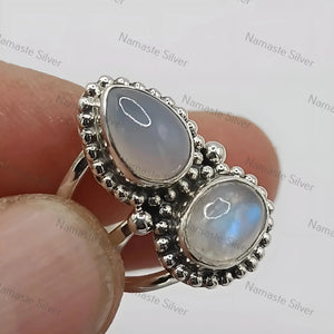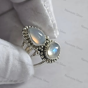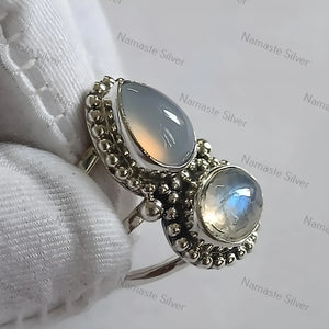 Chalcedony & Rainbow Moonstone Sterling Silver Ring, Natural Mystical Dual Gemstone Boho Handmade Statement Jewelry Gift for Her