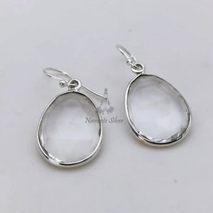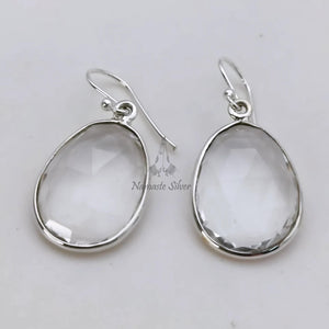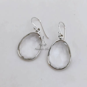 Clear Quartz Earrings, 925 Sterling Silver Dangle Drop Earrings, Natural Clear Quartz Checker Oval Gemstone Handmade Jewelry, Gift For Her