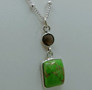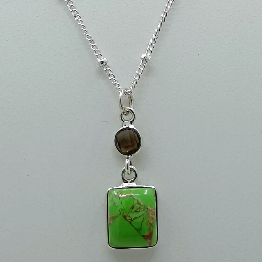 Green Copper Turquoise, Smoky Quartz Sterling Silver Handmade Necklace Dual Gemstone Pendant Chain Locket Gift for her Birthday Anniversary
