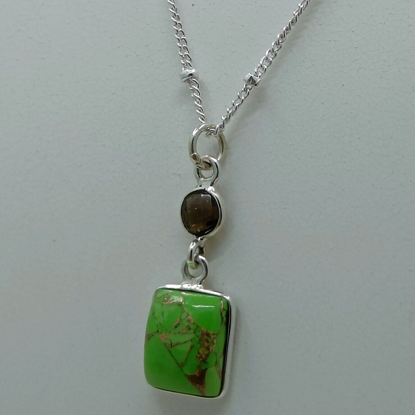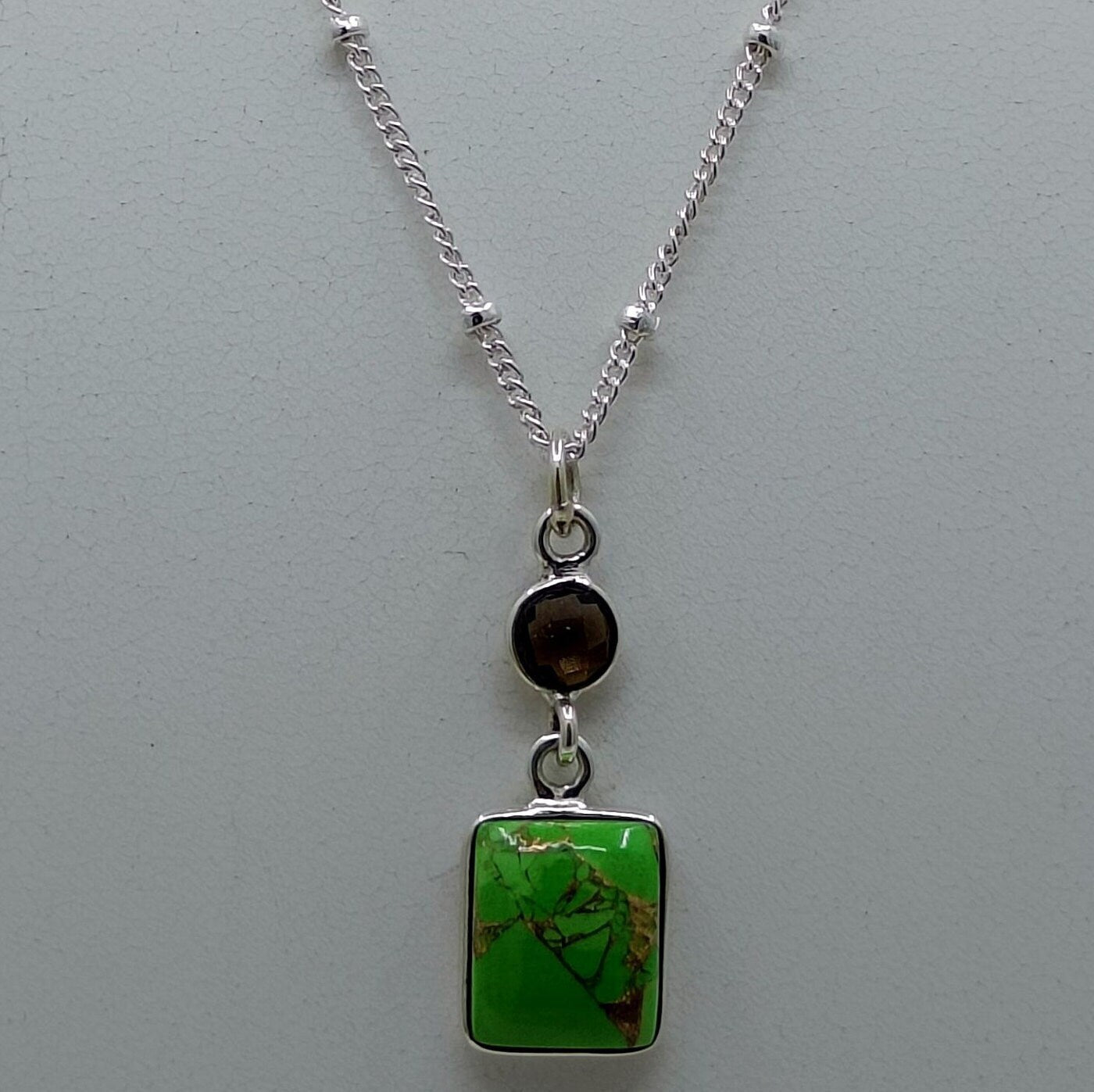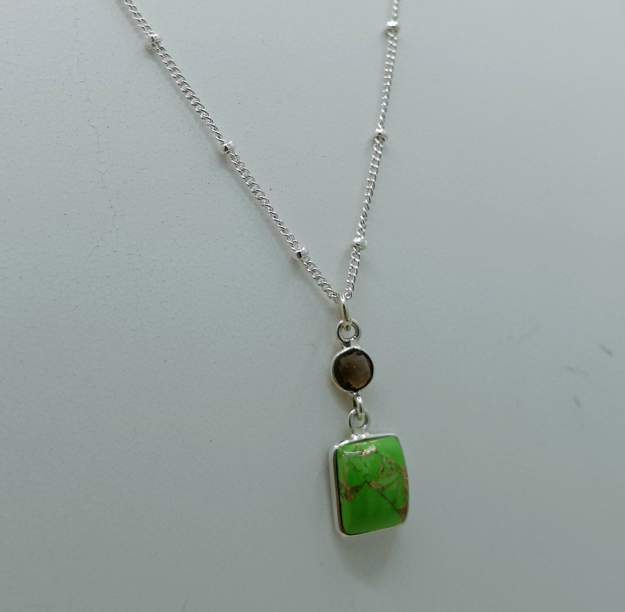 Embrace the captivating dance of light and color with this handcrafted necklace featuring a stunning dual gemstone pendant. A mesmerizing green copper turquoise shimmers with vibrant veins, its earthy energy harmonizing perfectly with the smoky quartz's enigmatic depths.