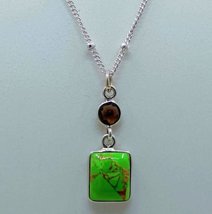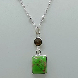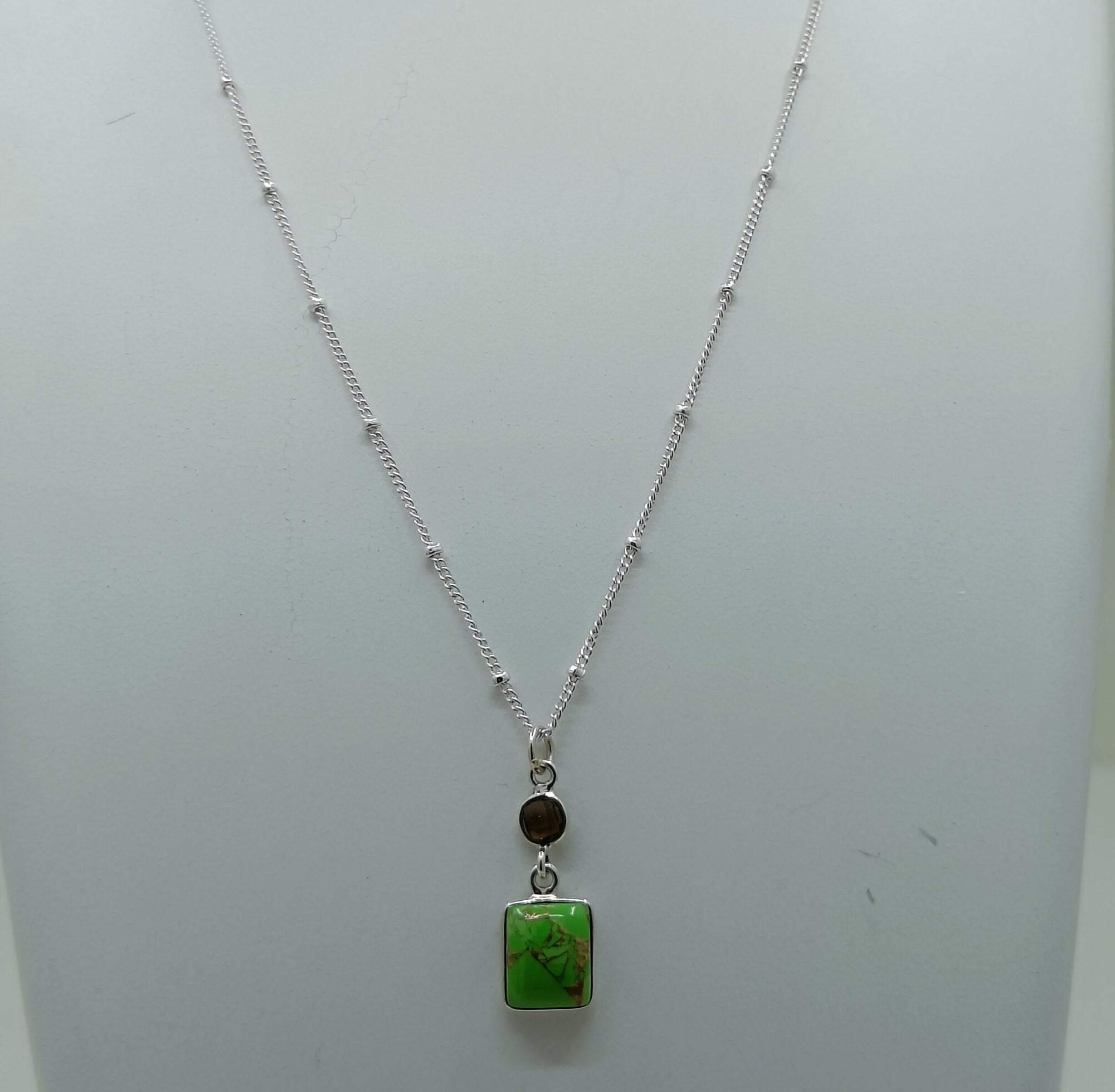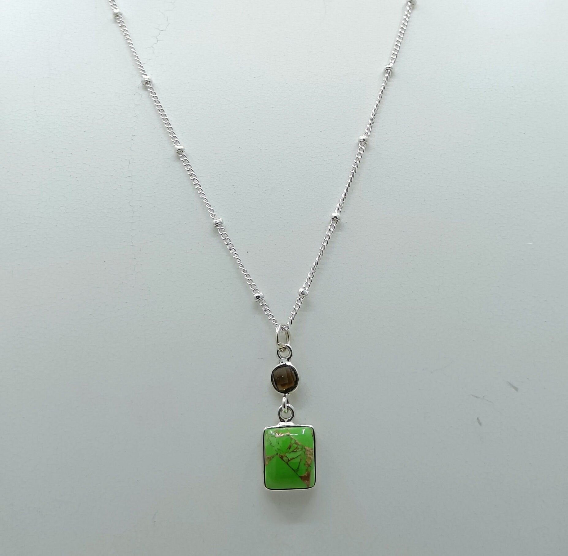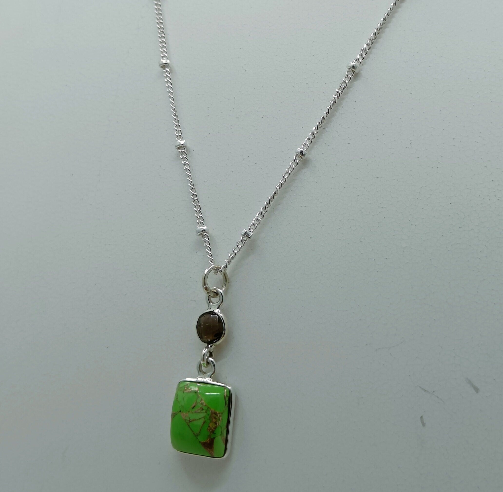 Embrace the captivating dance of light and color with this handcrafted necklace featuring a stunning dual gemstone pendant. A mesmerizing green copper turquoise shimmers with vibrant veins, its earthy energy harmonizing perfectly with the smoky quartz's enigmatic depths.