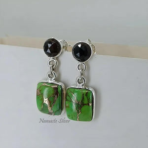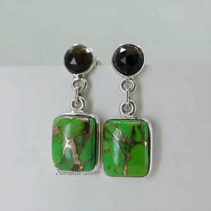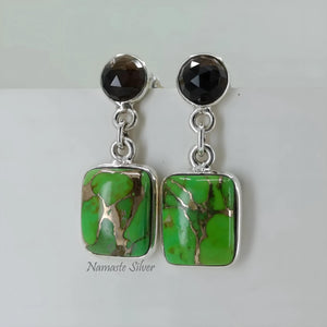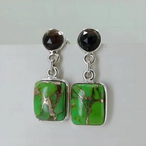 Green Turquoise Smoky Quartz Earrings, 925 Sterling Silver Dangle Earrings, Natural Dual Gemstone Handmade Boho Jewelry, Unique Gift For Her