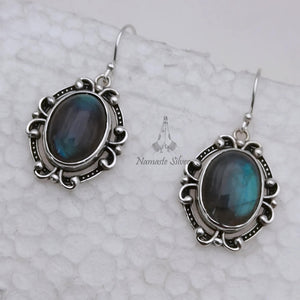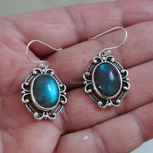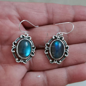 Labradorite Earrings, 925 Sterling Silver Dangle Earrings, Natural Labradorite Oval Gemstone Handmade Boho Jewelry, Birthstone Gift for Her