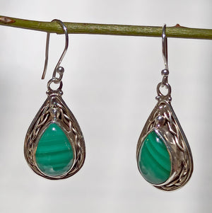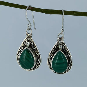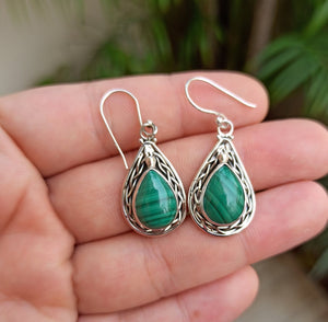 Sway with elegance and let the captivating energy of malachite flow through you with these stunning pear-shaped dangle earrings. Handcrafted with genuine 925 sterling silver, each gem boasts unique swirls of emerald green, promising a touch of nature's beauty with every movement.