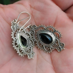 Natural Black Onyx Silver Dangle Earrings - 925 Sterling Silver Handmade Pear Shape Jewelry - Boho Chic - Anniversary Valentine's Day Gift for her