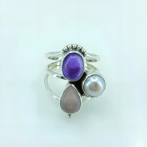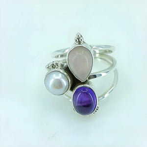 Navya Craft Triple Gemstone Amethyst, Rose Quartz, Pearl 925 Sterling Silver Handmade Statement Ring boho ring Custom Size 4 to 13 Christmas Anniversary Birthday Valentine Day Gift wife