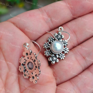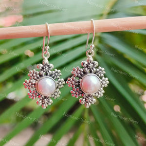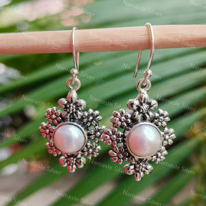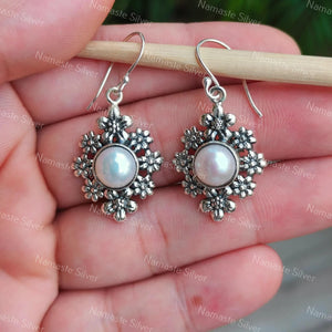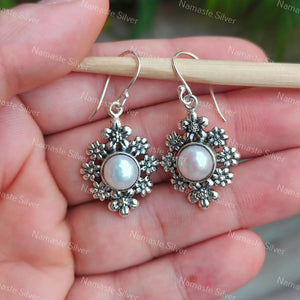 Home Pearl Earrings, 925 Sterling Silver Flower Dangle Earrings, Freshwater Pearl Handmade Floral Jewelry, June Birthstone, Gift For Her Birthday