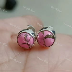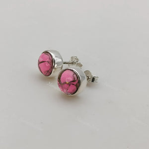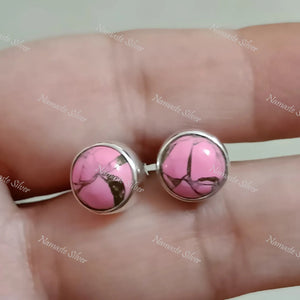 Pink Turquoise Stud Earrings, 925 Sterling Silver Stud Posts, Pink Copper Turquoise Round Gemstone Handmade Jewelry, Minimalist Gift For Her