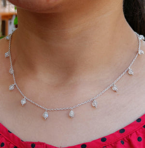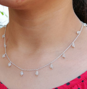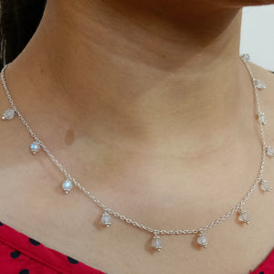 ✨ Revel in the minimalist allure of this silver necklace, where each moonstone sparkles with a magical rainbow glow. As you move, these faceted beads reflect light, offering a serene luminescence.