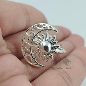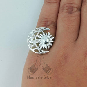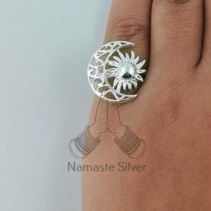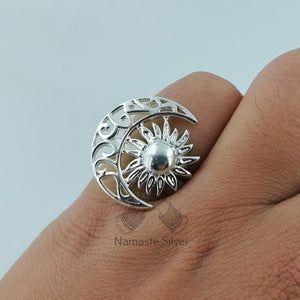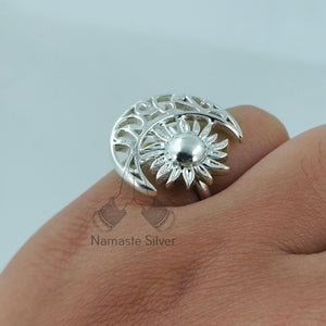 Silver Sun Moon Ring, 925 Sterling Silver Ring, Handmade Boho Jewelry, Crescent Moon Ring, Celestial Jewelry, Gift for Her, Celestial Ring