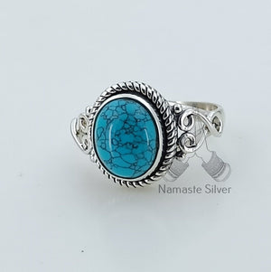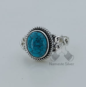 Step into the vibrant soul of the desert with this stunning turquoise oval ring. Nestled amidst a handcrafted sterling silver band adorned with delicate boho accents, the luminous turquoise gemstone radiates a mesmerizing blend of sky blue and earthy green, captivating every eye it meets.
